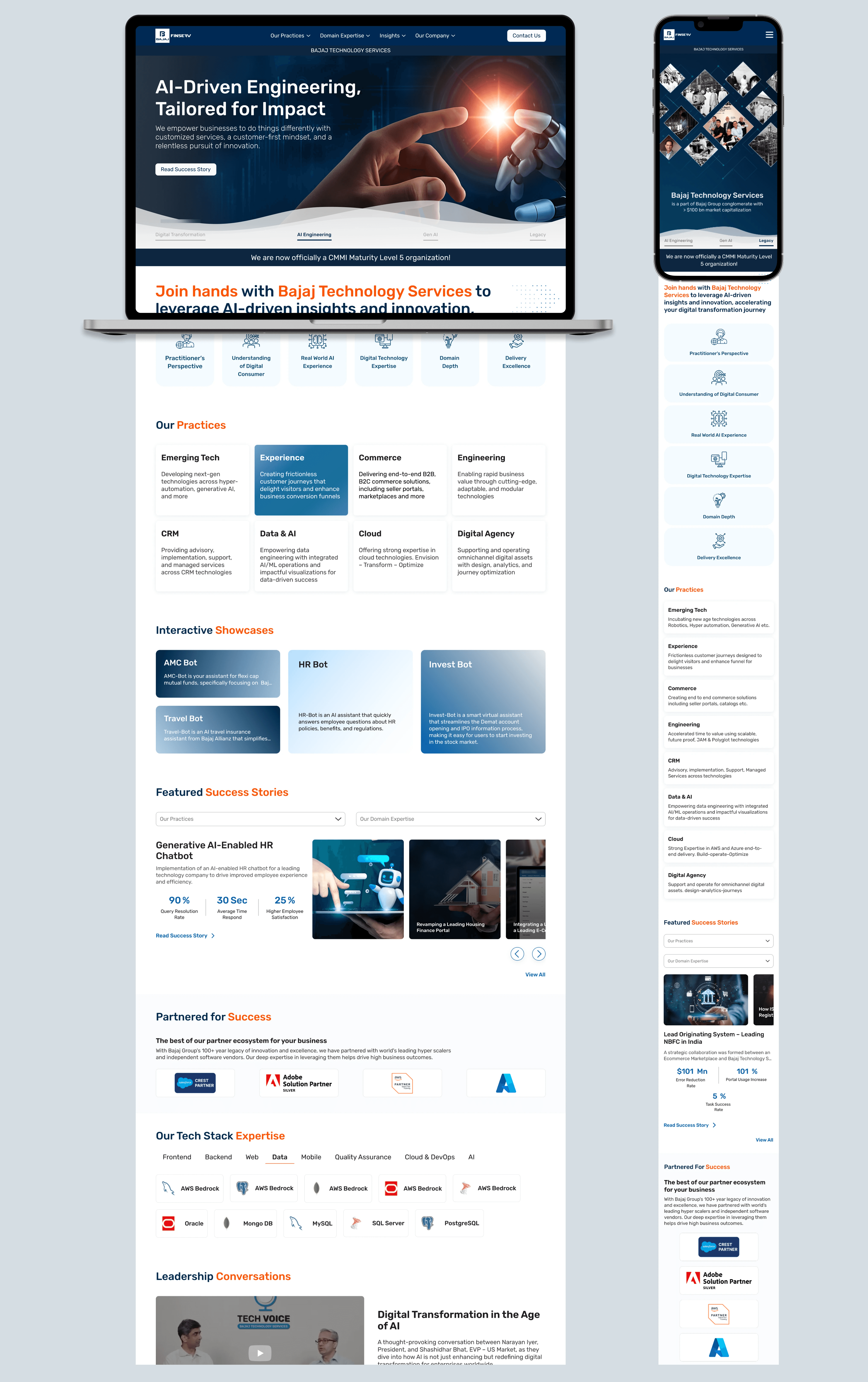 Bajaj Technology Services, a newly established technology division of Bajaj Finserv, wanted to design and develop a company website that would serve as a key touchpoint for clients to learn about the organization. The website was envisioned as a platform to showcase the company’s offerings, expertise, and success stories.