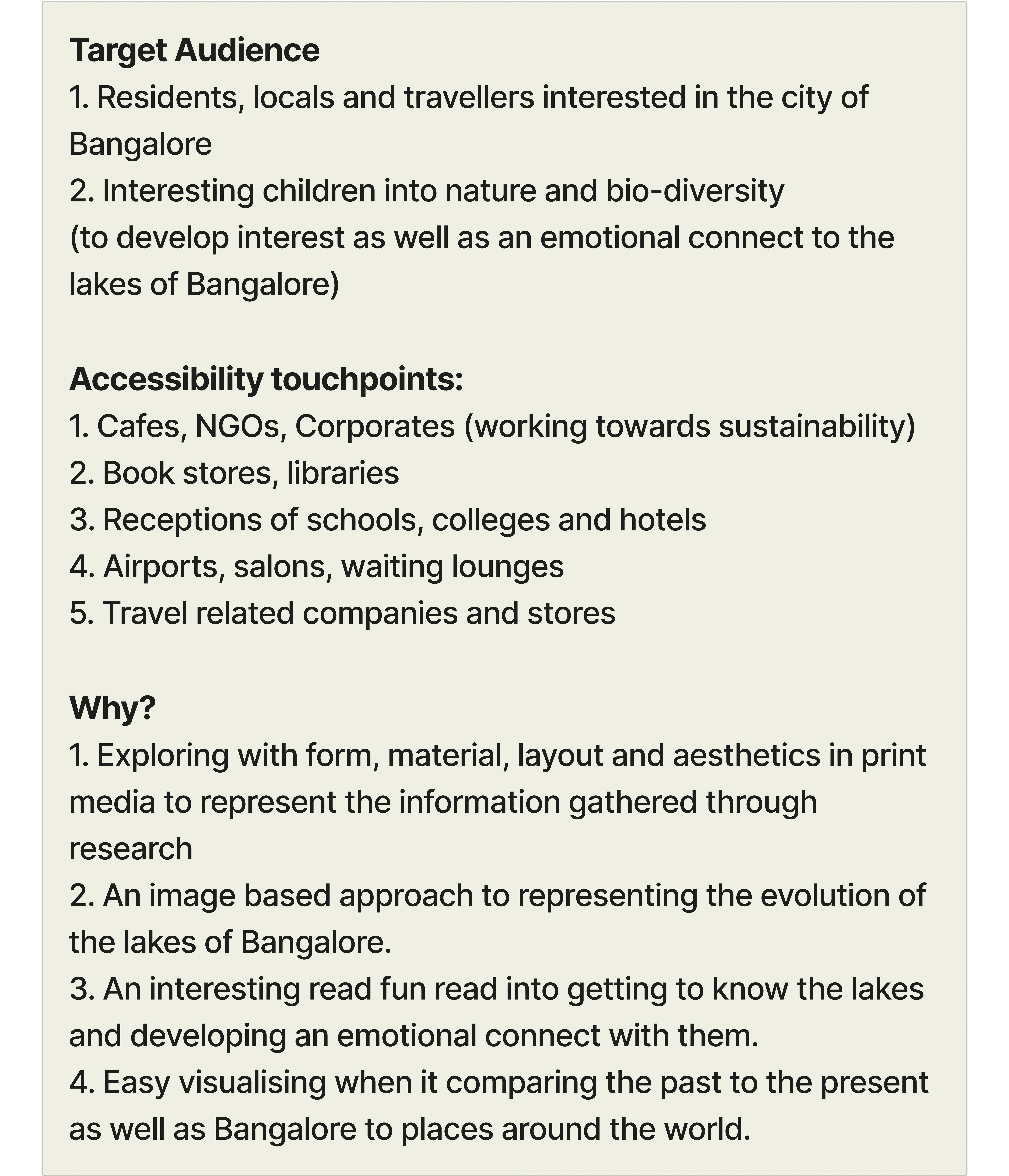 This project involved studying Bangalore’s lake systems in terms of their history, evolution, and the challenges they face, such as pollution and encroachment. The goal was to then translate this research data into a form that conveys the information easily while raising awareness about the lakes’ significance and the need for urgent conservation.